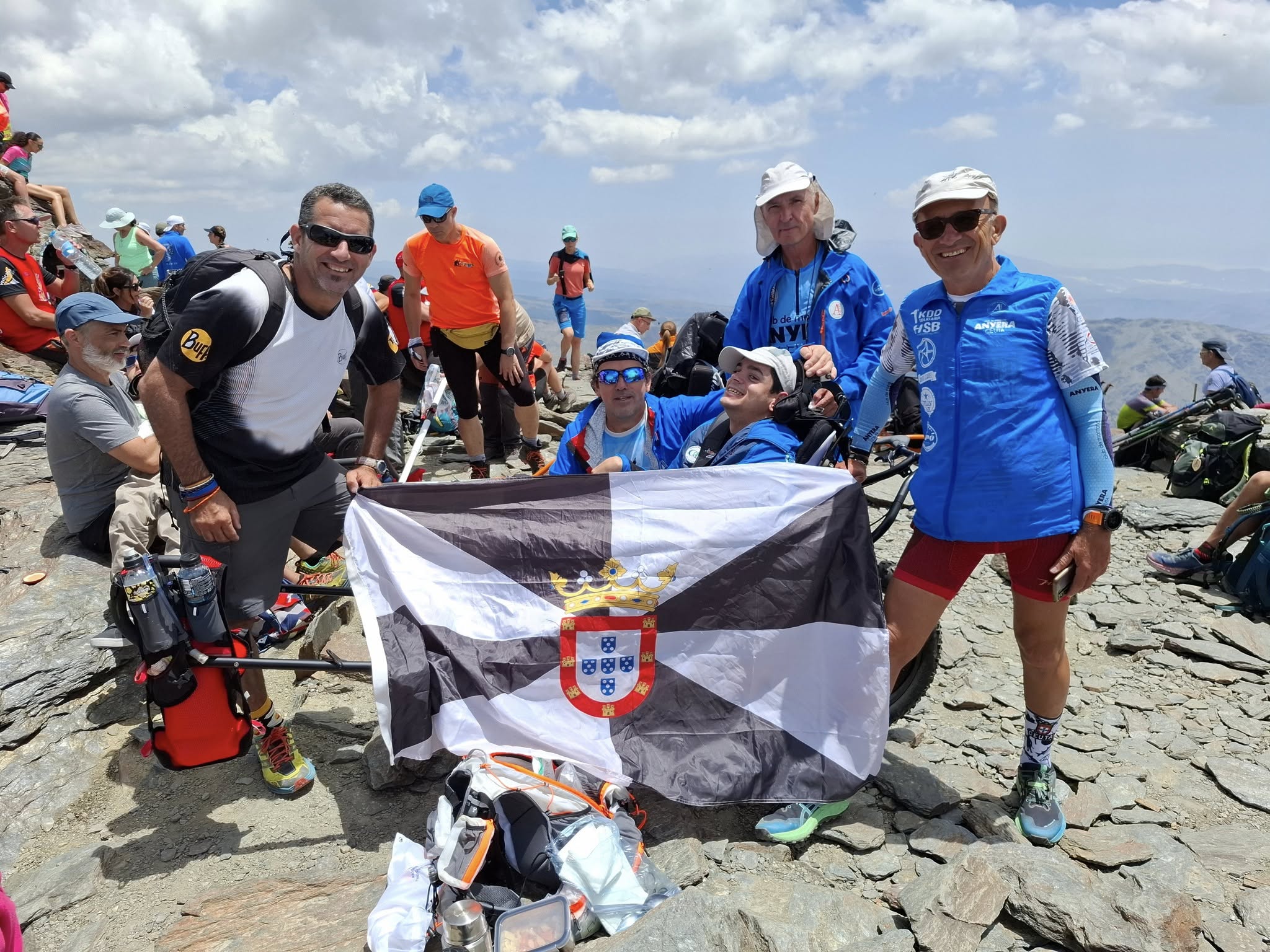 Las tres personas con movilidad reducida, uno de ellos el ceutí Agustín de Souza, han ascendido en sillas Joelette gracias a la ayuda de sus impulsores. La representación ceutí ha posado orgullosa con la bandera de la ciudad una vez alcanzada la cima de Sierra Nevada, en Granada.