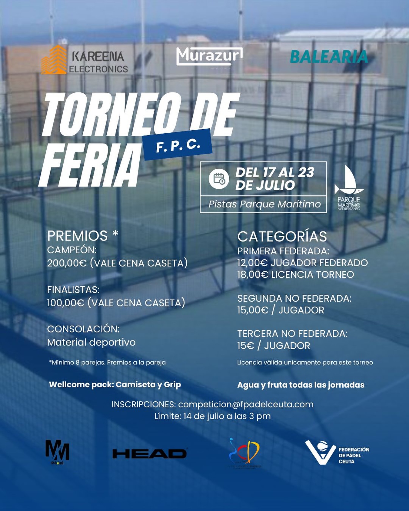 La Federación de Pádel de Ceuta ha organizado el Torneo de Feria, que se va a celebrar del 17 al 23 de julio en las pistas del Parque Marítimo de Mediterráneo. Habrá tres categorías y las inscripciones permanecerán abiertas hasta el 14 de julio a las 15:00 horas.