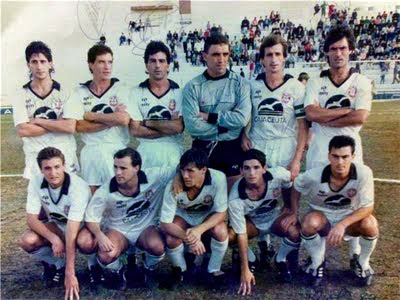 Antelo, el mejor futbolista, con diferencia, que he visto jugar en el Ceuta. Qué delantero! Y Julio Soler puede ser considerado como uno de los mejores futbolistas caballas de la historia, siempre por detrás, por supuesto, de Pirri y Nayim. Julio que al igual que otro de los grandes como es nuestro Anuar también salió del San Agustín, jugó además de en el Albacete unos años en el Betis a un gran nivel. Un equipazo este Ceuta de la foto donde también veo a Ondina, Goyo, Pedro Barrientos o Gambín, que la temporada siguiente lo fichó el Rayo Vallecano en Primera.