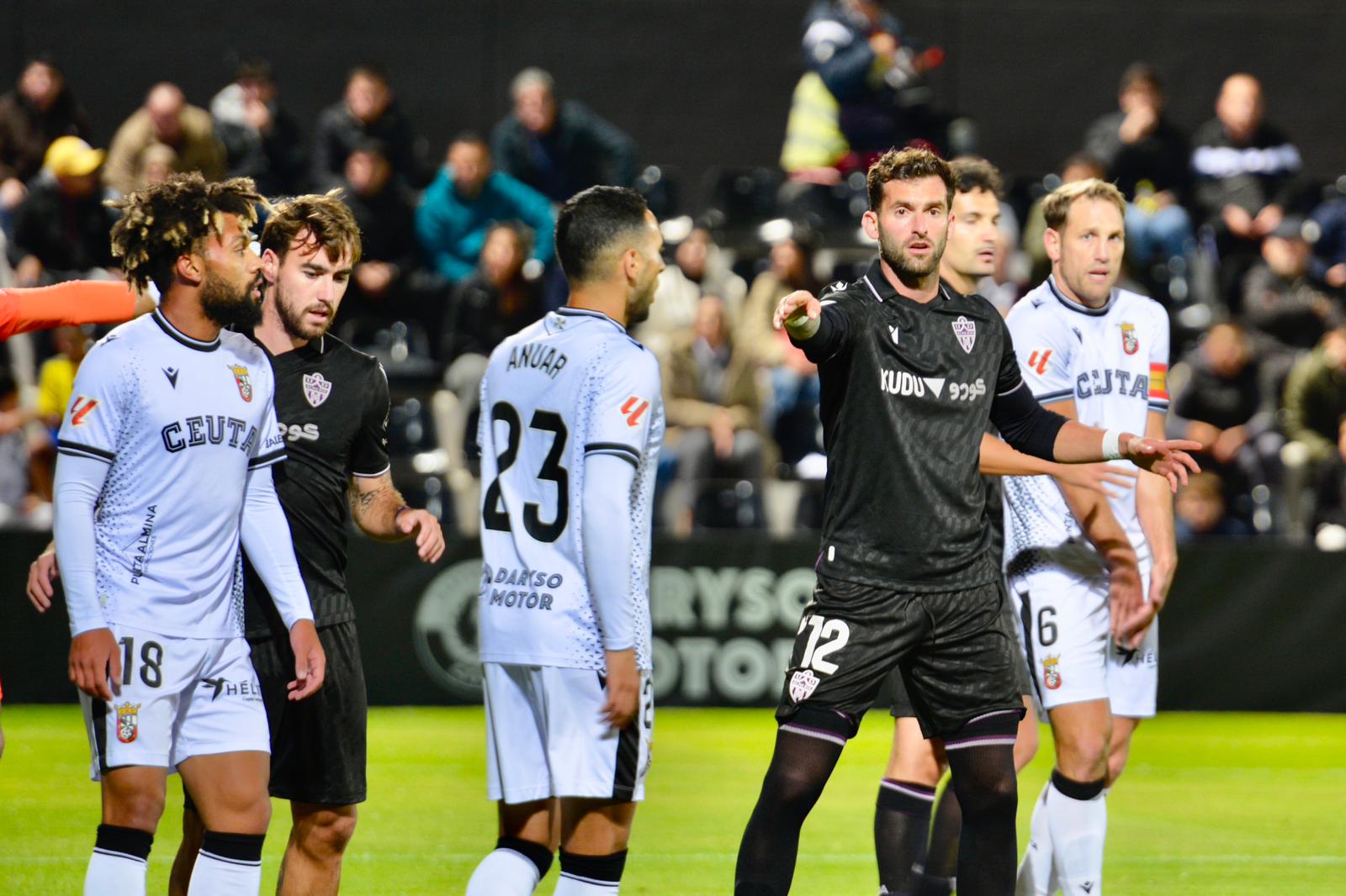 El jugador del Ceuta, se coge del cuello y le hace un Bruce Lee.
